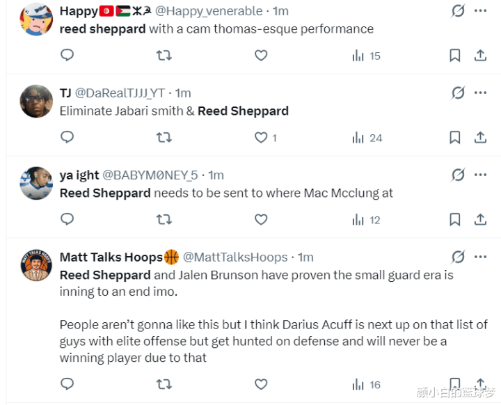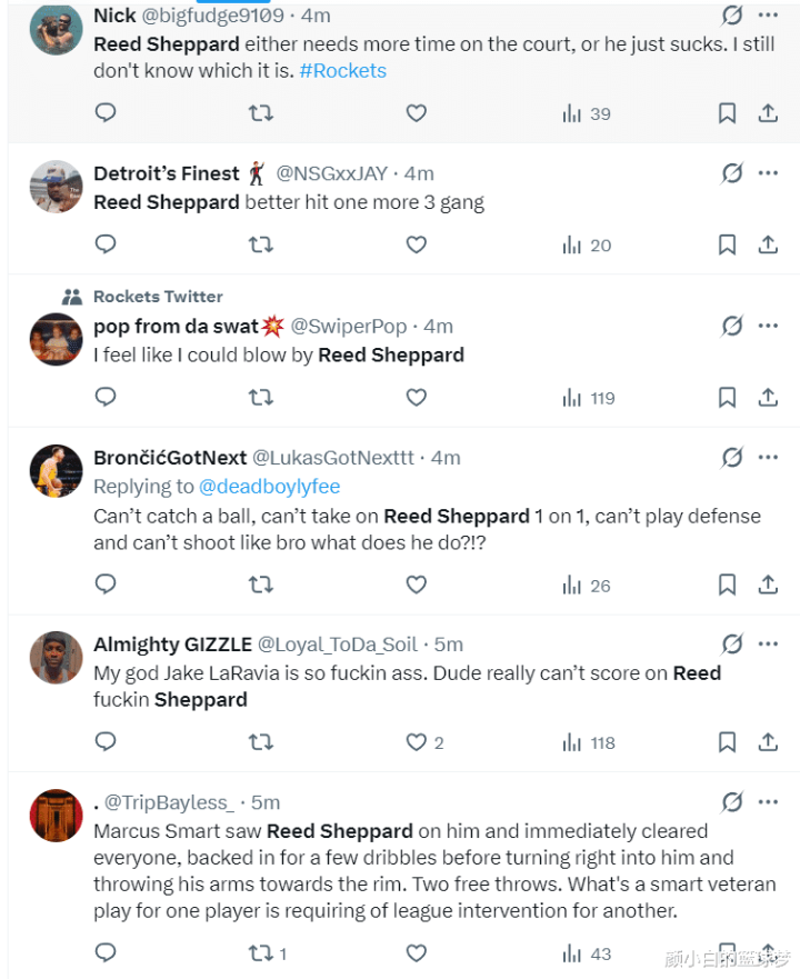 太多的火箭球迷对谢泼德嚼齿穿龈了:1.连球齐拿不住;2.篮下上篮齐上不进;3.我以为我齐比谢泼德更强;4.果然是太差劲了,这还给他更多登场时辰;