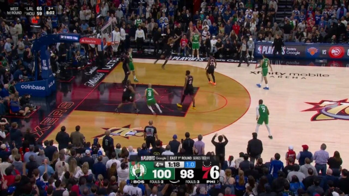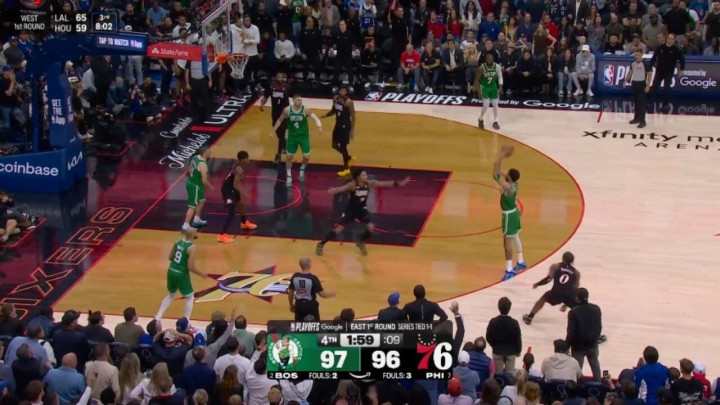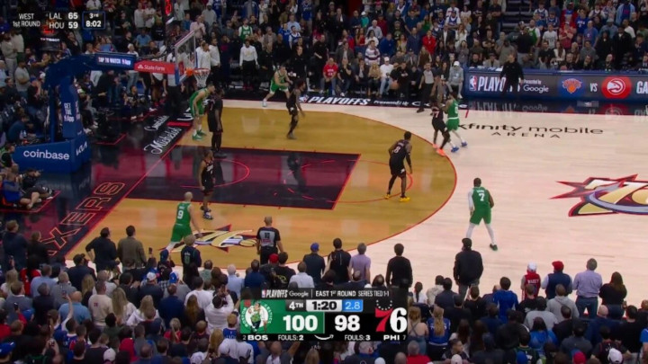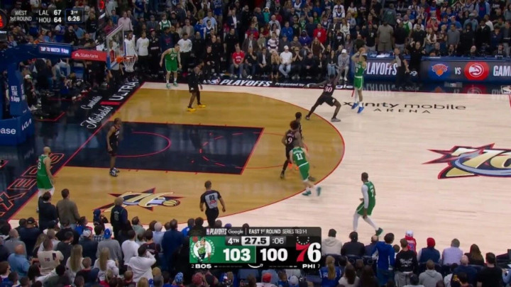 ——剩下1分17秒前,乔治陈述了一记上篮后,塔图姆助攻普里查德三分,跳跃5分