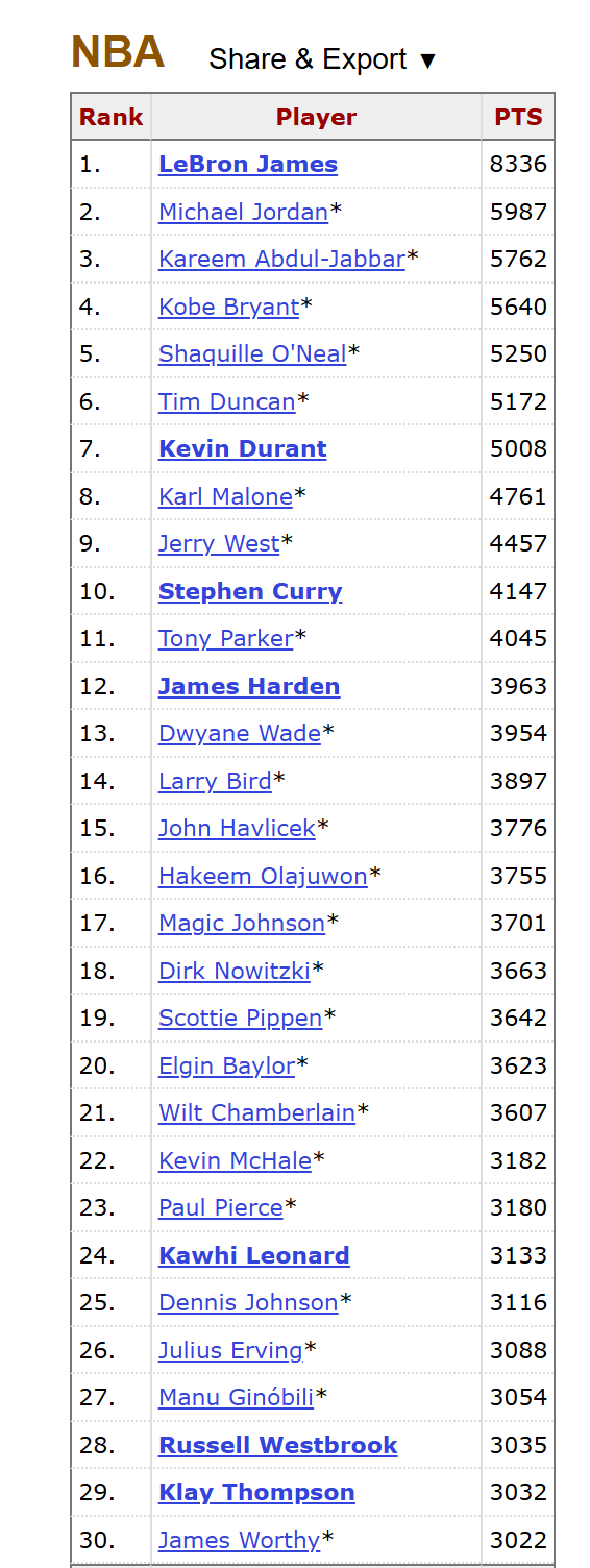 值得一提的是,本场比赛事后,塔图姆的季后赛生存总得分达到了3005分。 总分3005分在惯例赛可能不算多,但在季后赛可就不相似了,28岁52天的塔图姆也曾卓绝了在NBA效用了21年的克里斯保罗(2981分),升至NBA历史第31位。 下图是这份榜单现时的前30位,不是名东谈主堂,即是改日的名东谈主堂,并且不出只怕的话,本年季后赛,他就能卓绝詹姆斯沃西、克莱汤普森、威少、吉诺比利等东谈主。 ![]() 皇冠客服飞机:@seo3687